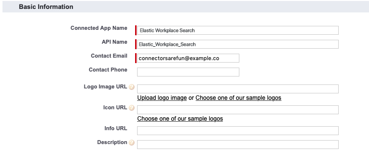 • Connected App Name: A name to help you identify the application. Workplace Search, or something like that.