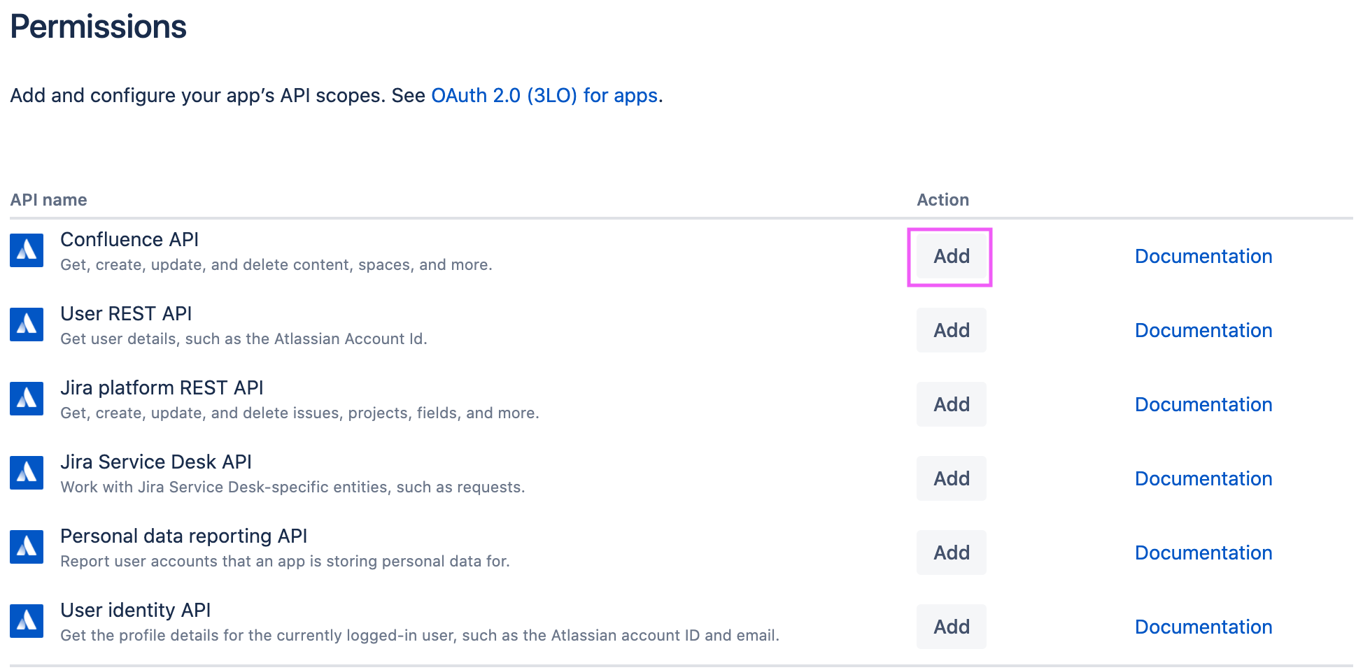 Step 8. Click Permissions, find Confluence API and click Add, then Configure:
