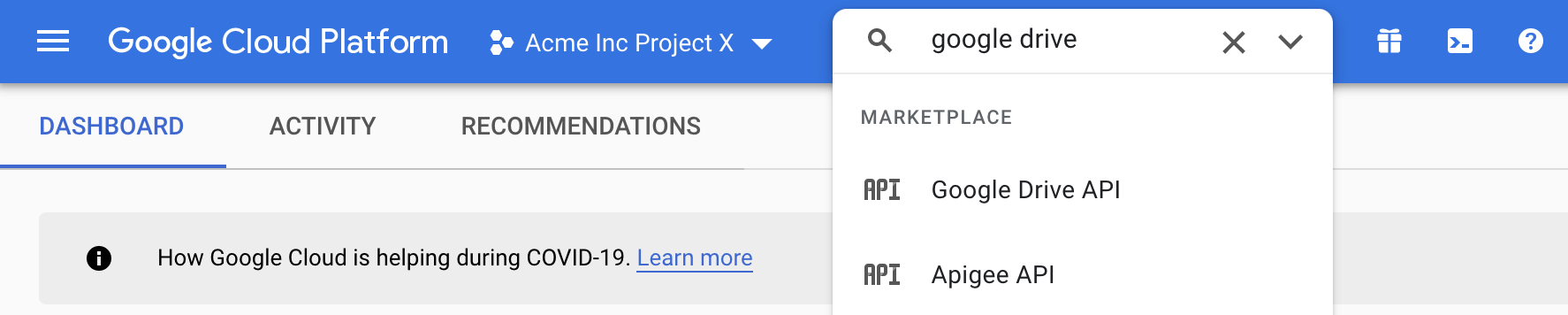 Step 3. Using the search bar located at the top of the console, navigate to the Google Drive API:
