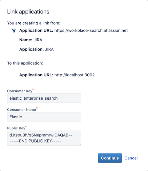 Step 1. From the Workplace Search administrative dashboard’s Sources area, locate Jira Server and click Configure. You are presented with a Public Key and a Consumer Key. Copy these keys and keep them handy, as we’ll need them in just a second.