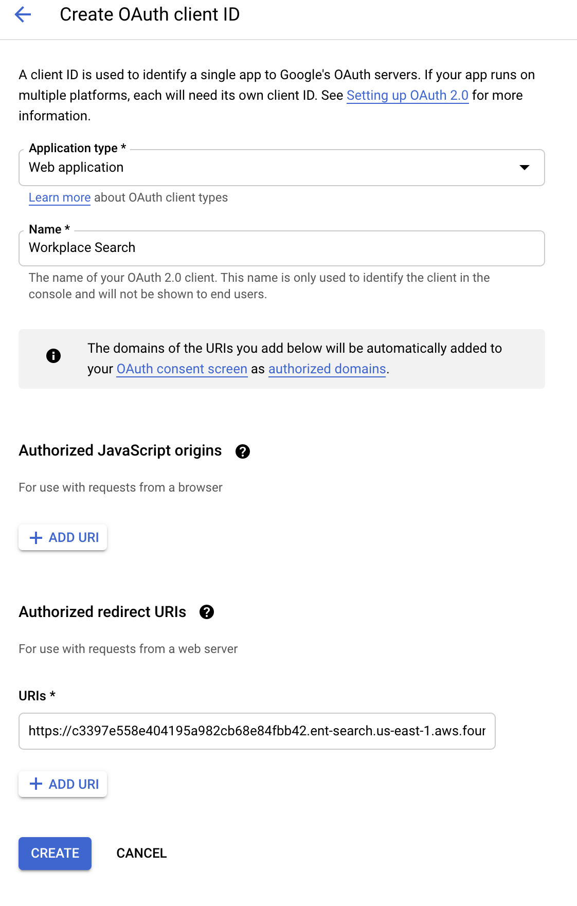 • Authorized redirect URIs: The Workplace Search OAuth redirect URL for your deployment.