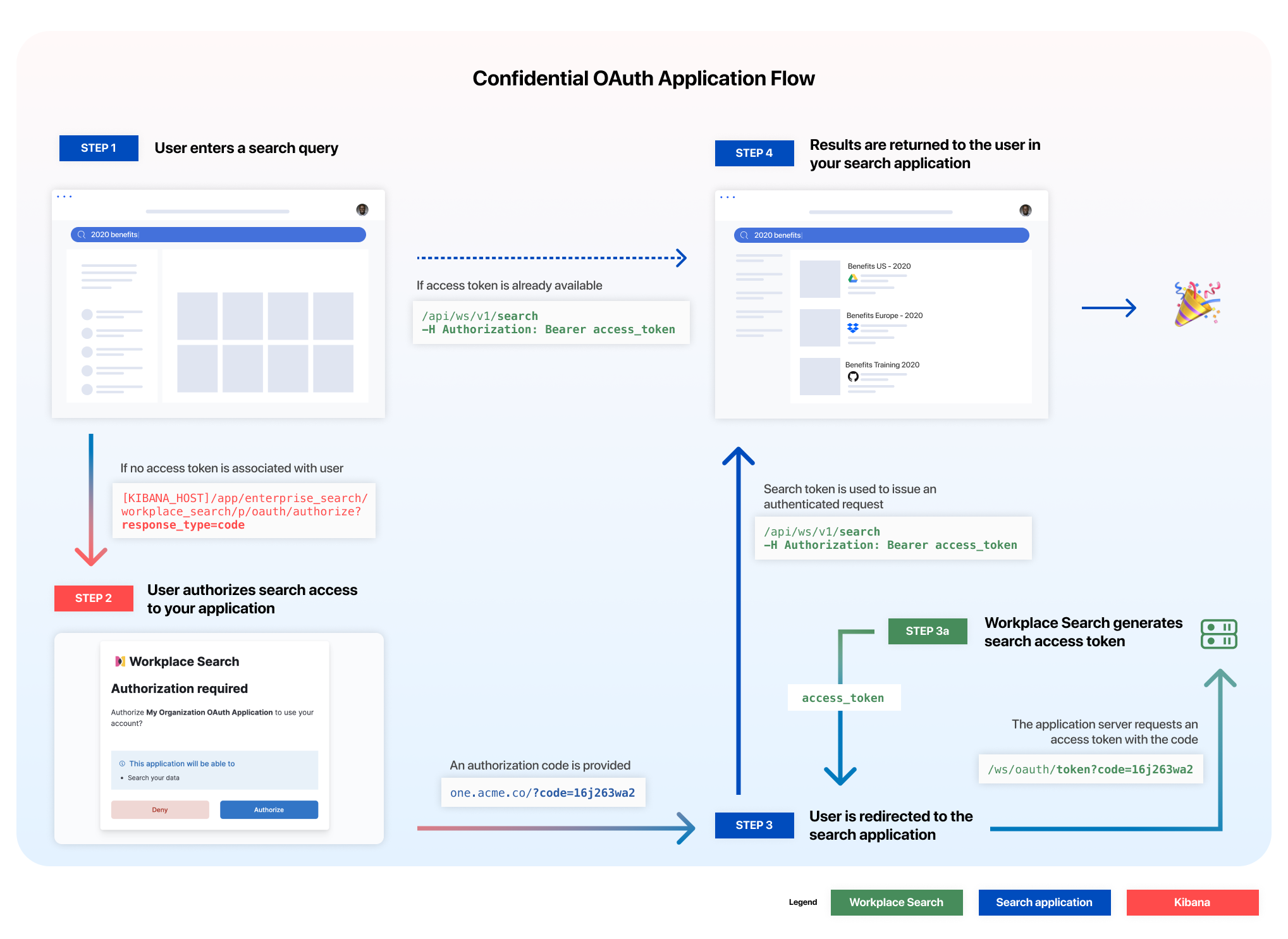 The confidential OAuth flow requires that the application server (in this case our internal knowledge platform) handles the trading of a generated authorization code and client secret in exchange for an access token.