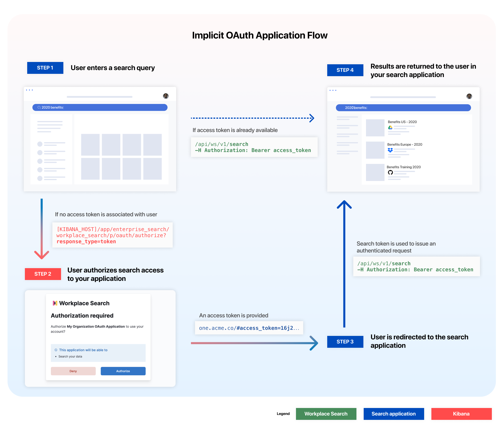 With the help of our newly created OAuth application, we are now ready to implement unified search on the Acme Inc. internal knowledge platform. Depending on the strategy you chose, the access token and authentication sequence will differ slightly.