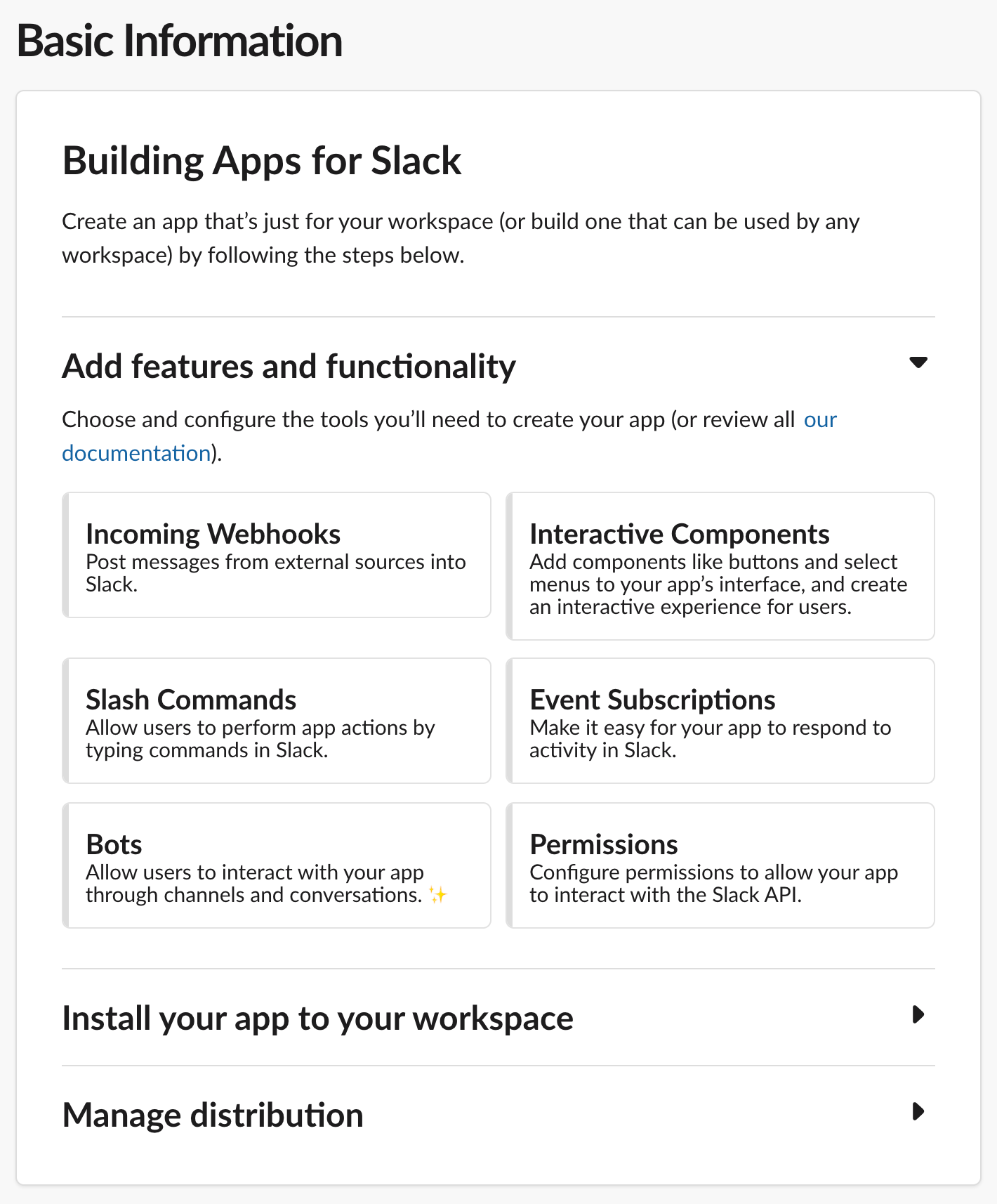 Step 5. Next, on the left-hand side of the application menu, click Basic Information. Under the section Install your app to your workspace, select Install or Request to Install your application. Which you will see depends on your permissions. An admin must approve the application if you lack the permissions to do so.