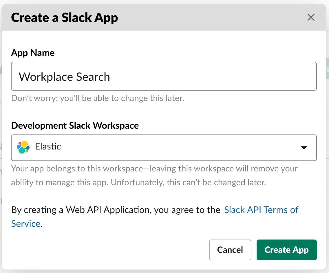 Step 2. Create an app, and then configure appropriate access levels. Click Create New App when prompted. In the modal, provide a name — like Workplace Search — and choose the right Workspace. After that, click Create App.