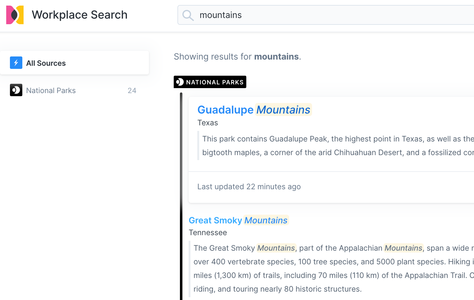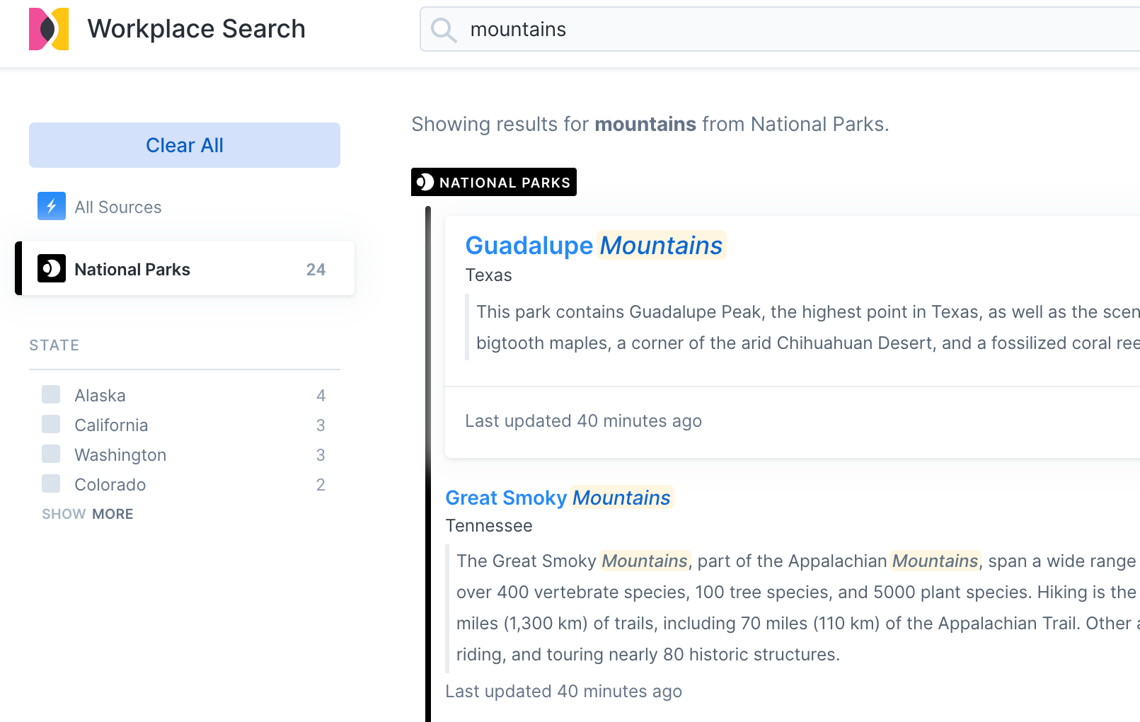 Step 5. Now we can see the search experience includes a filter for State. Note that you generally need to filter on a specific source to expose filters for that source (in this case the National Parks source).