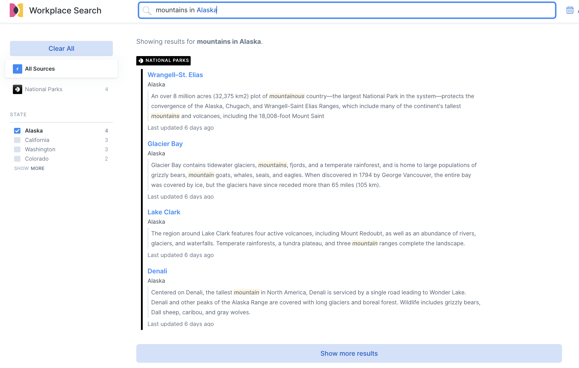 Now when your users issue queries like mountains in Alaska or mountains inside California, the state in their search box will highlight blue, and the corresponding facet will automatically be checked.