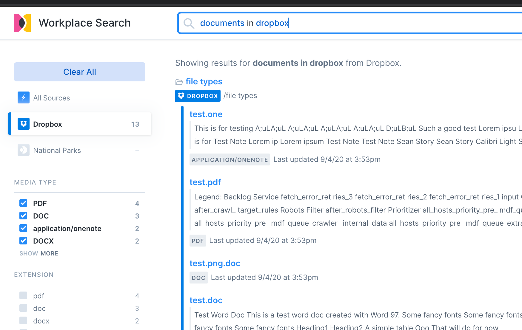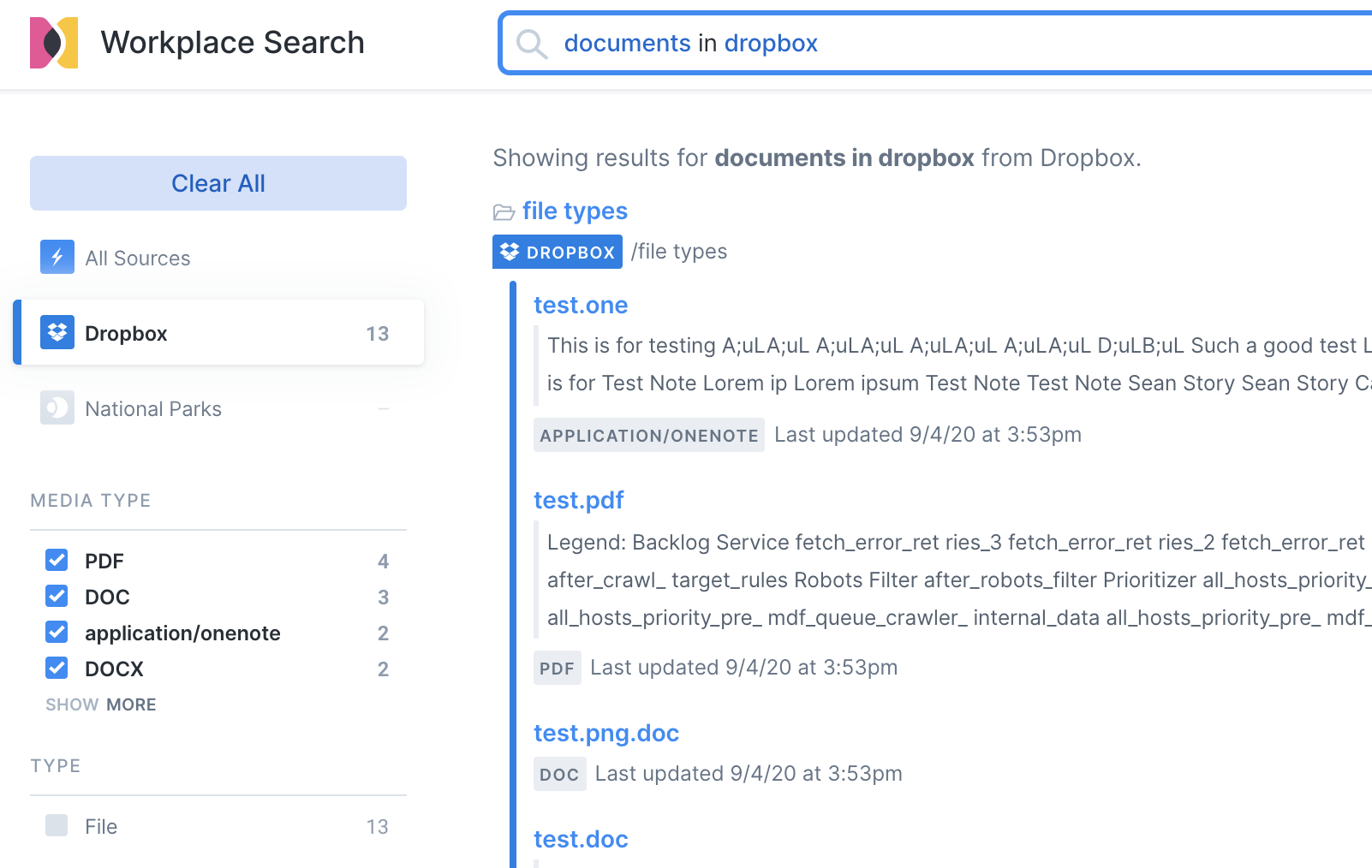 editHere we’ll hide a filter on a first-party source. These steps assume you have already connected a source. This example will involve a Dropbox source with a number of test documents. Here’s the search experience without any modifications. Note that the search is filtering on Dropbox only to make use of Dropbox filters:
