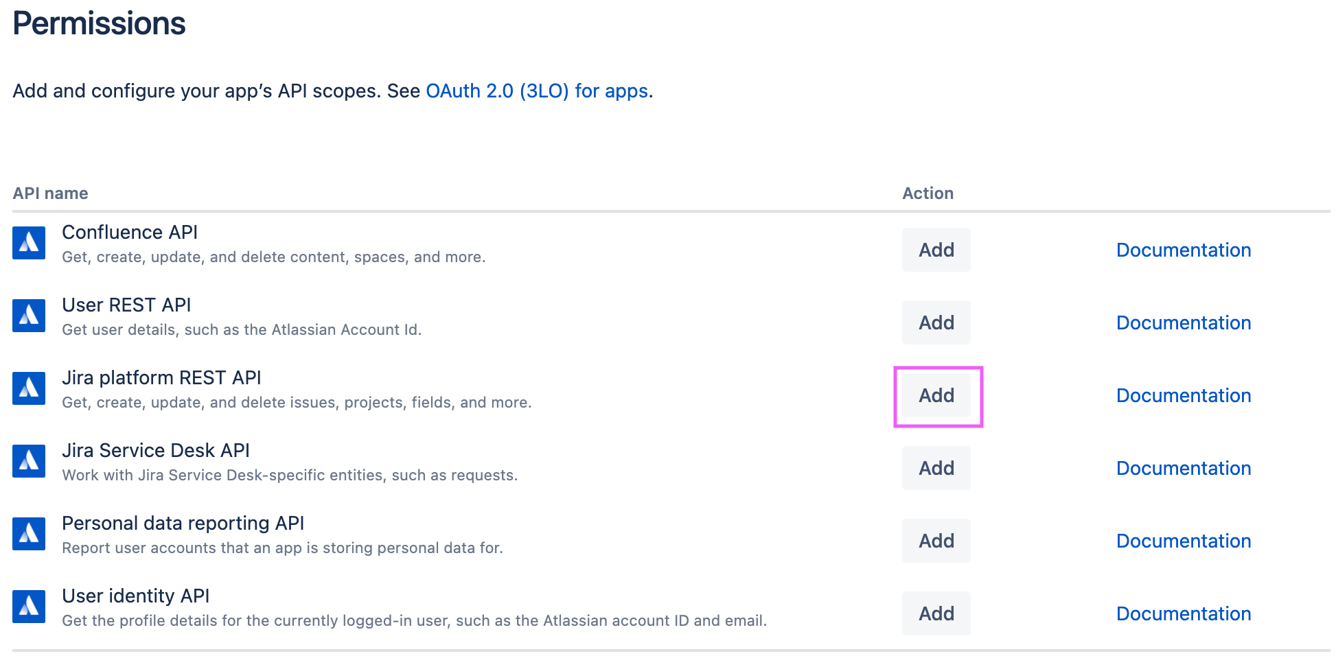 Step 8. Click Permissions, find Jira platform REST API and click Add, then Configure: