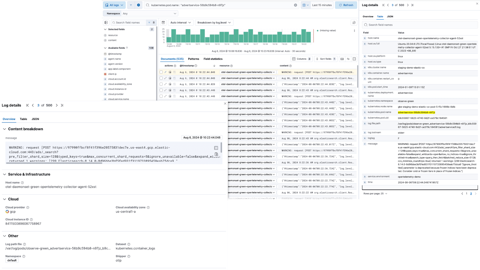 With Elastic OpenTelemetry Collector, container and application logs are enriched with Kubernetes metadata out-of-the-box making filtering, grouping and logs analysis easier and more efficient.