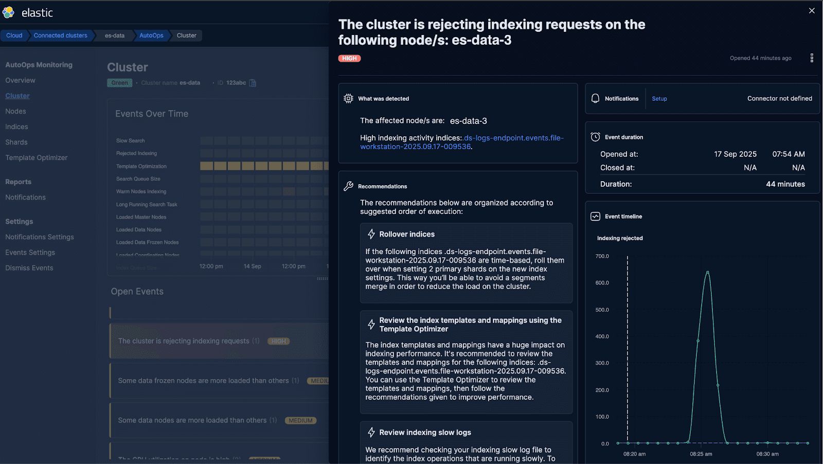Simplify your Elasticsearch operations with real-time issue detection and actionable recommendations to optimize performance and reduce costs. AutoOps is available for cloud and self-managed deployments. Learn more about AutoOps.