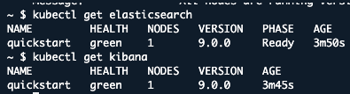 11. You can also run kubectl get elasticsearch and kubectl get kibana for more specific stats like Elasticsearch version, nodes, and health.