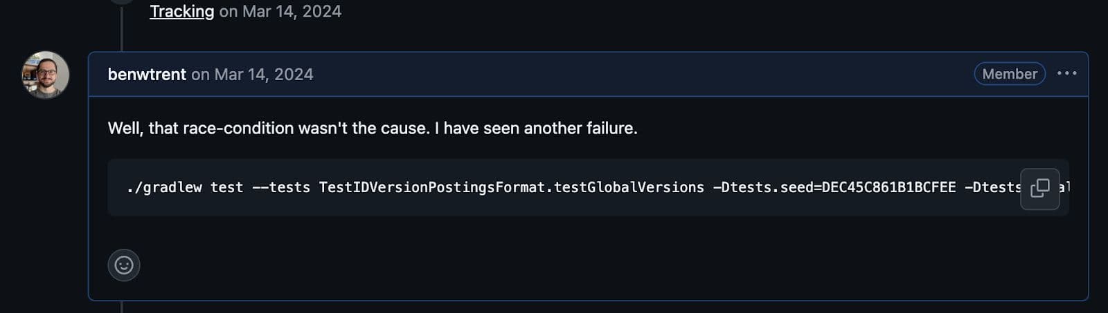 Concurrency bugs are the worst. Not only are they difficult to fix, simply getting them to fail reliably is the hardest part. Take this test failure, TestIDVersionPostingsFormat#testGlobalVersions, as an example. It spawns multiple document writing and updating threads, challenging Lucene’s optimistic concurrency model. This test exposed a race condition in the optimistic concurrency control. Meaning, a document operation may falsely claim to be the latest in a sequence of operations 😱. Meaning, in certain conditions, an update or delete operation might actually succeed when it should have failed given optimistic concurrency constraints.