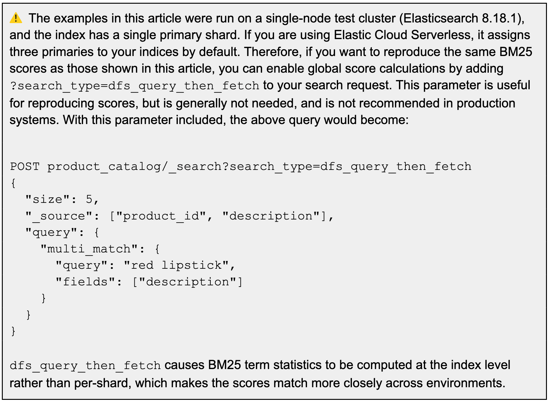 This returns a pure BM25 ranking (without any cohort boosting). In this example, the scores of LIP-001 and LIP-002 will be very close (or identical), because they match the same query terms with similar frequencies and have comparable lengths.