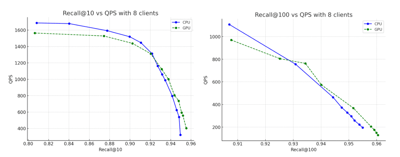 - Recall: Accuracy remains effectively the same between CPU and GPU runs, with the GPU-built graph reaching marginally higher recall.