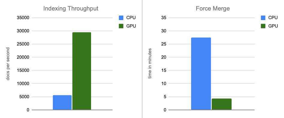 - Force-merge: After indexing completes, the GPU continues to accelerate segment merging, speeding up the force-merge phase by ~7x.