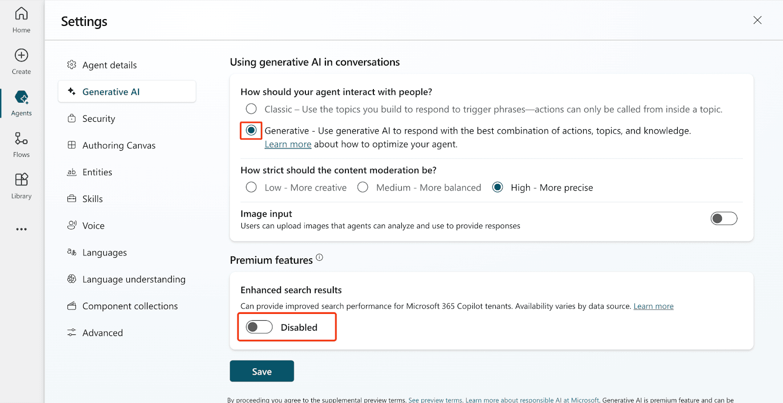 3. Click on Settings and activate Generative AI to be able to use GenAI to process the conversation. Select Actions, Knowledge, and Topics, depending on what Copilot detects in the conversation.