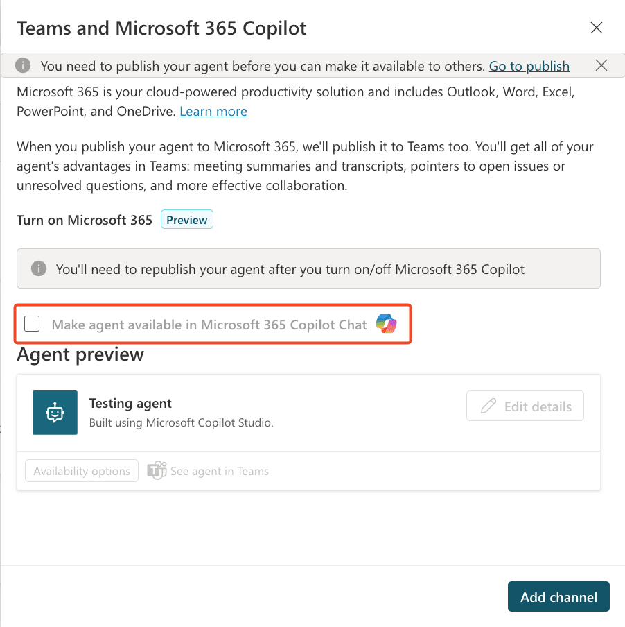 To use the agent from Microsoft 365 or Microsoft Teams, you must follow these steps: