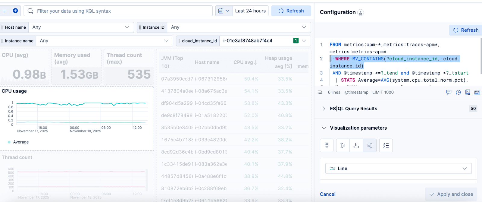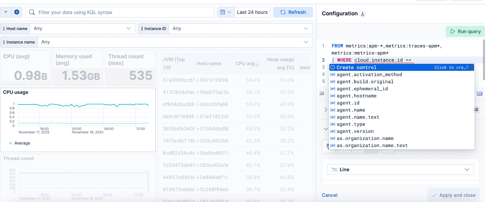 Variable controls look similar on the surface, but they come with a clever twist: instead of automatically filtering every panel on your dashboard, they can be plugged directly into ES|QL queries inside individual visualizations.
