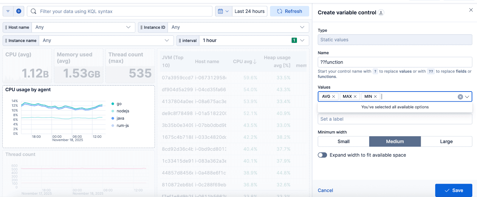 We’re excited to share that variable controls are now available in Kibana dashboards starting from version 8.18 and all the 9.x series! This feature has been one of the most consistently requested additions from dashboard users—and it’s finally here 🎉 Over the past few months, we’ve continued expanding and refining variable controls, making it the perfect moment to give them their own dedicated blog post.