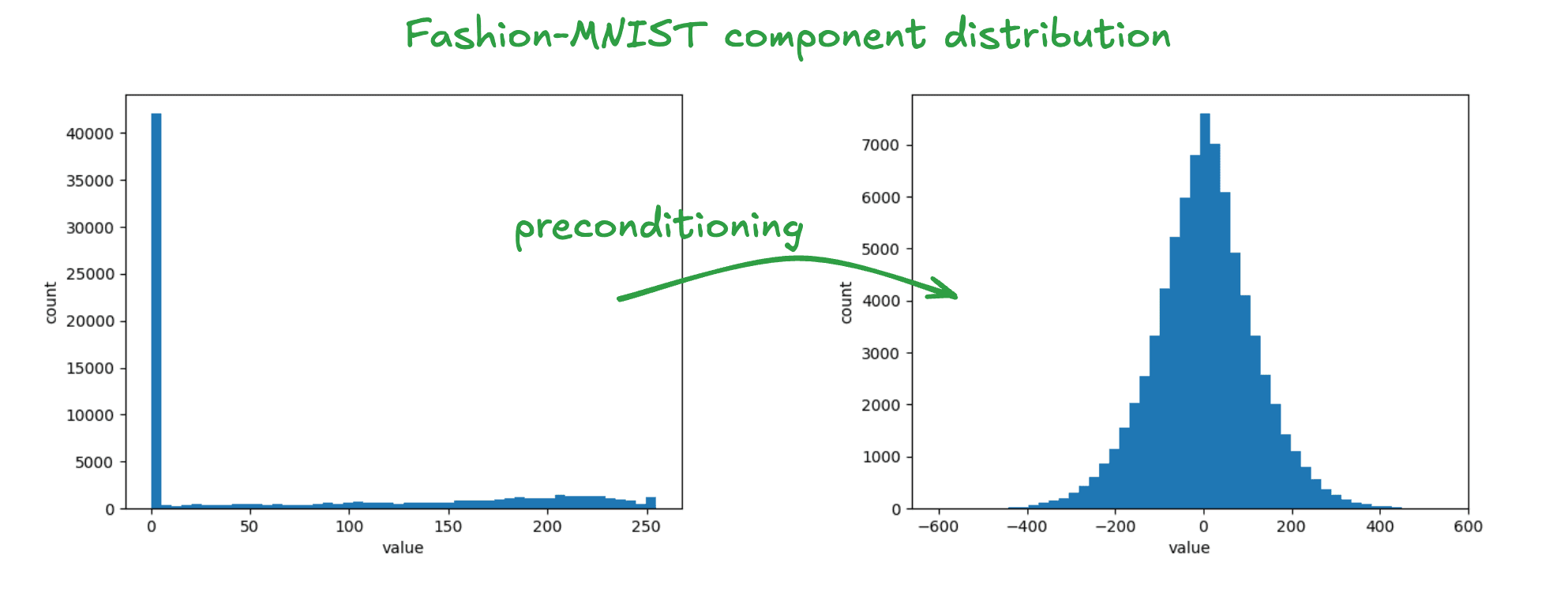 The same holds for cosine similarity and Euclidean distance. So the transform can just be applied to each vector before quantizing it and no further changes are needed to either the index or query procedure. For our purposes, another important property of this transformation is that it makes the component distributions more normally distributed. This is a consequence of the central limit theorem. Specifically, the component of the transformed vector corresponds to the summation where are approximately independent random variables. It is easy to sample such a matrix: first sample elements independently from the standard normal distribution and then apply modified Gram-Schmidt orthogonalization to the resulting matrix (which is almost surely rank full). The figure below shows the impact of this transform on the component distribution when it’s applied to the Fashion-MNIST dataset.