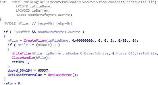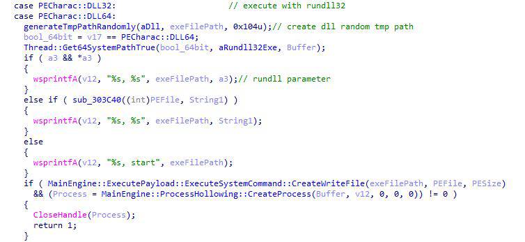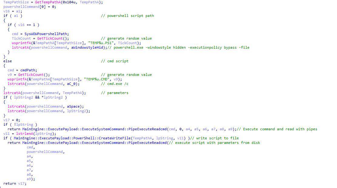 An operator can execute PowerShell scripts or CMD scripts in the infected machine, the malware can either write the script to a file in the temporary folder with a randomly generated name as follow: TEMP<digits>.PS1 for PowerShell or TEMP<digits>.CMD for a Command shell. The malware then passes parameters to it if specified by the malicious actor and executes it, the malware uses named pipes to retrieve the output of the PowerShell process.