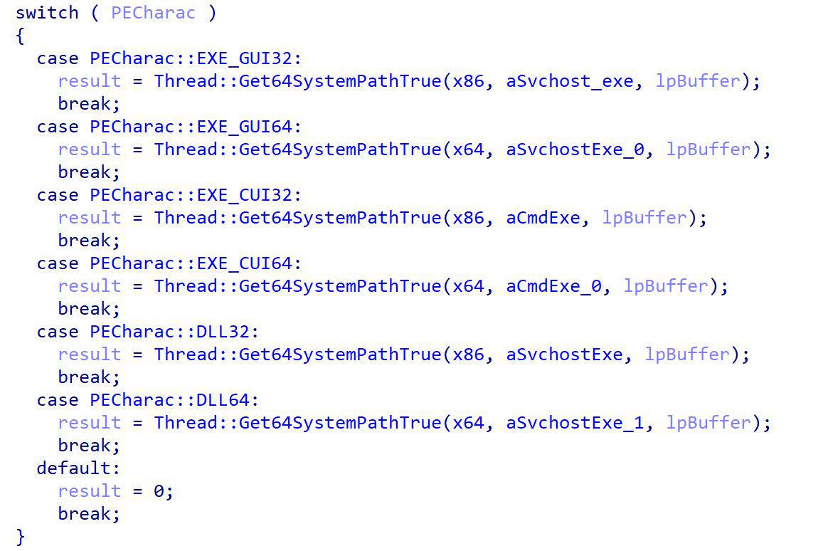 If the PE file is CUI (Console User Interface), the malware will choose cmd.exe , however, if it is GUI (Graphical User Interface) or a DLL PE file it will choose svchost.exe.