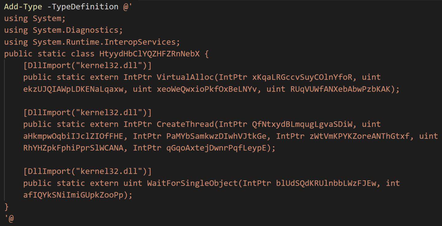 The PowerShell loader uses inline C# to load APIs needed for shellcode injection as seen in the following pseudocode.
