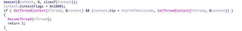 The agent will then set the thread context with SetThreadContext and point the instruction pointer of the suspended process to the shellcode then it will simply resume the execution with ResumeThread.