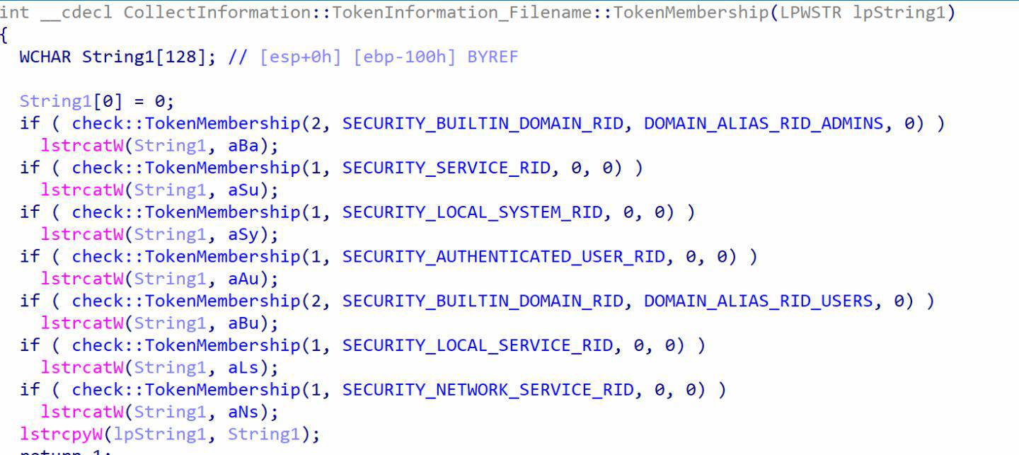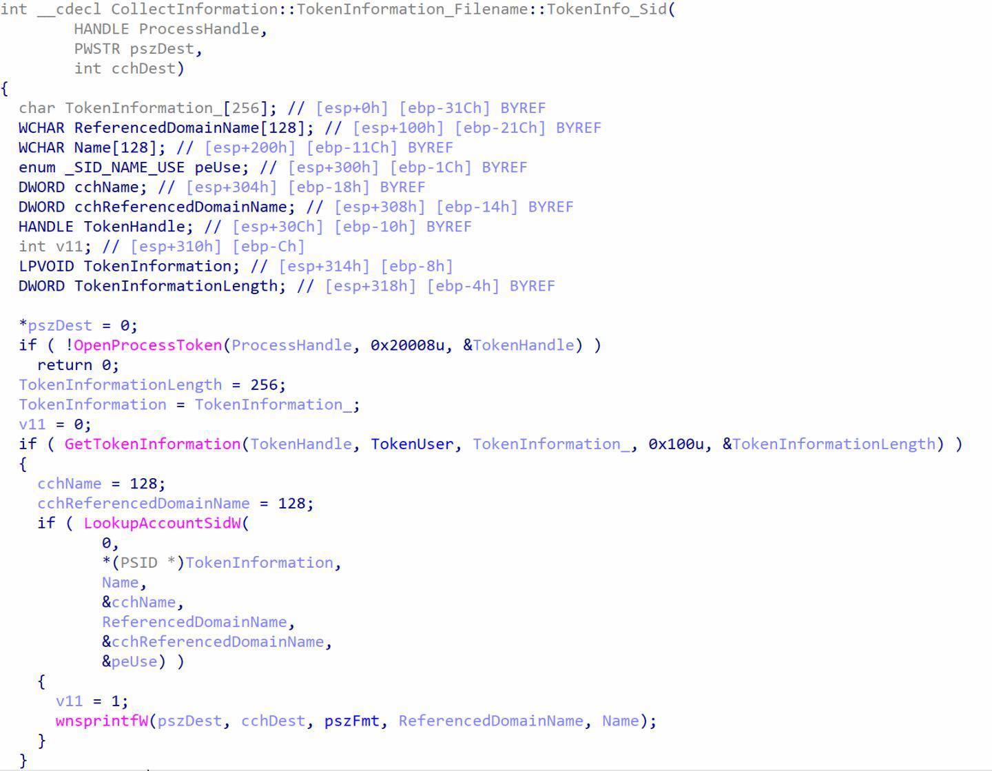The malware opens a handle to the current process with OpenProcessToken and gets the structure that contains the user account of the token with GetTokenInformation. It then retrieves the username and domain of the user account with the LookupAccountSidW API and concatenates the 2 strings in the following format: DOMAIN\USERNAME.