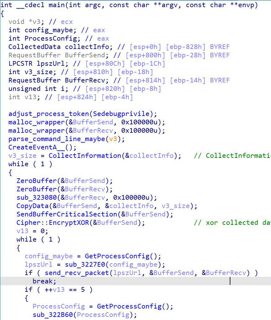 Once the working threads are started, the main thread will continue beaconing to the C2 server to retrieve commands. The main loop is made up of the following: