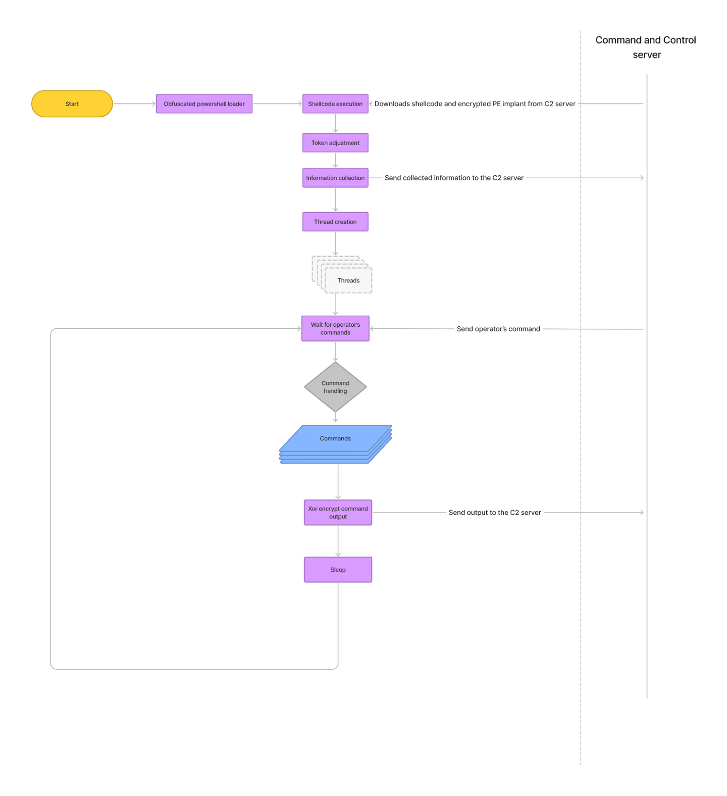 This section dives deeper into the BUGHATCH execution flow, threading and encryption implementation, communication protocol with C2, and finally supported commands and payload execution techniques implemented.