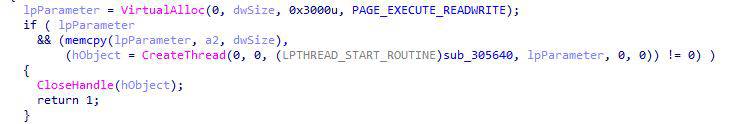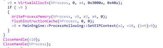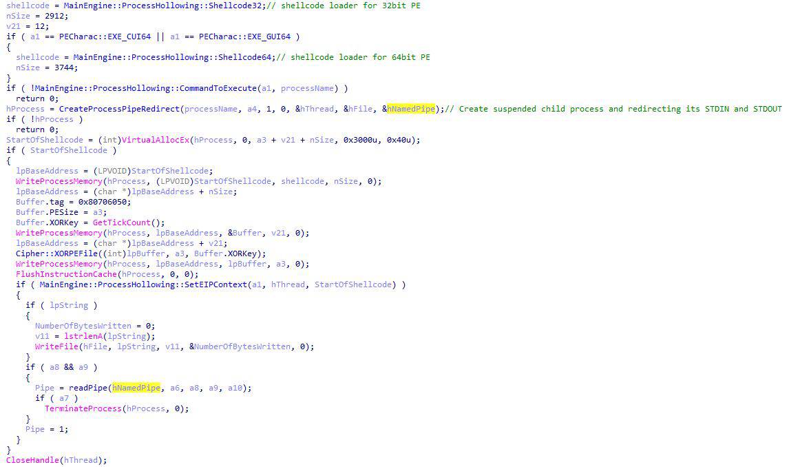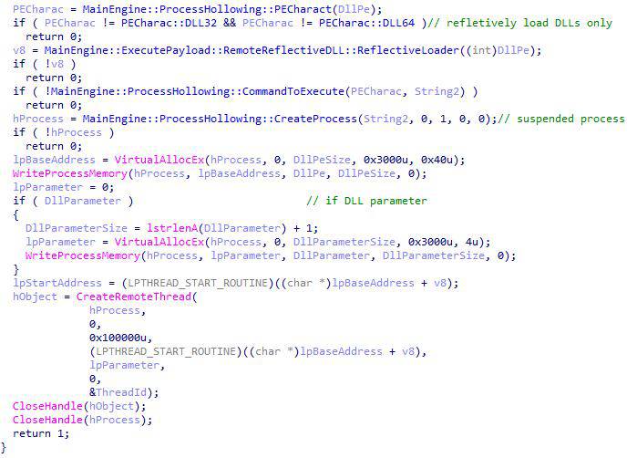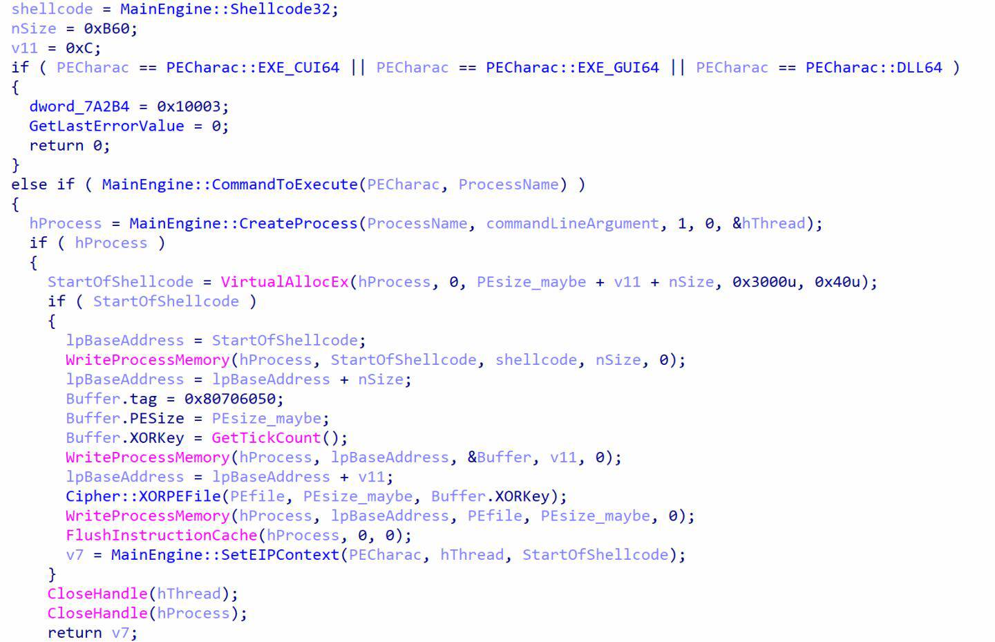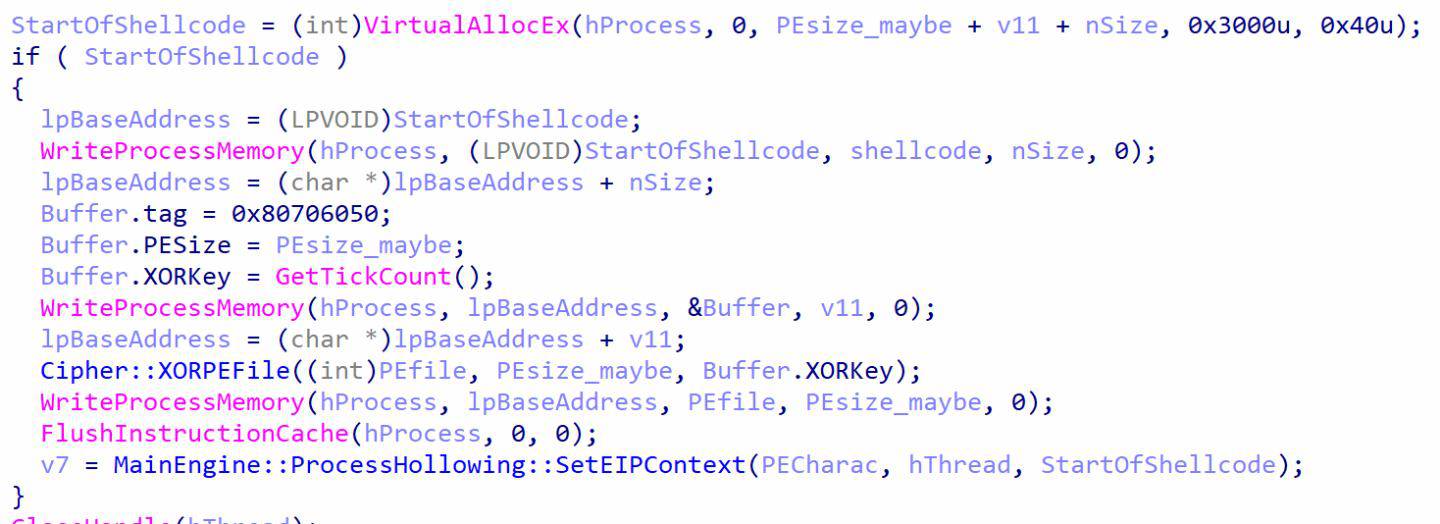 The malware will then create a suspended process with CreateProcessA API (either cmd.exe or svchost.exe ) and allocate a large amount of memory with VirtualAllocEx in the created process, it will then copy a position independent shellcode stored in the .rdata section to the newly allocated memory that is responsible for locating according to a specific tag the appended PE file, decrypt it and reflectively load it in memory.