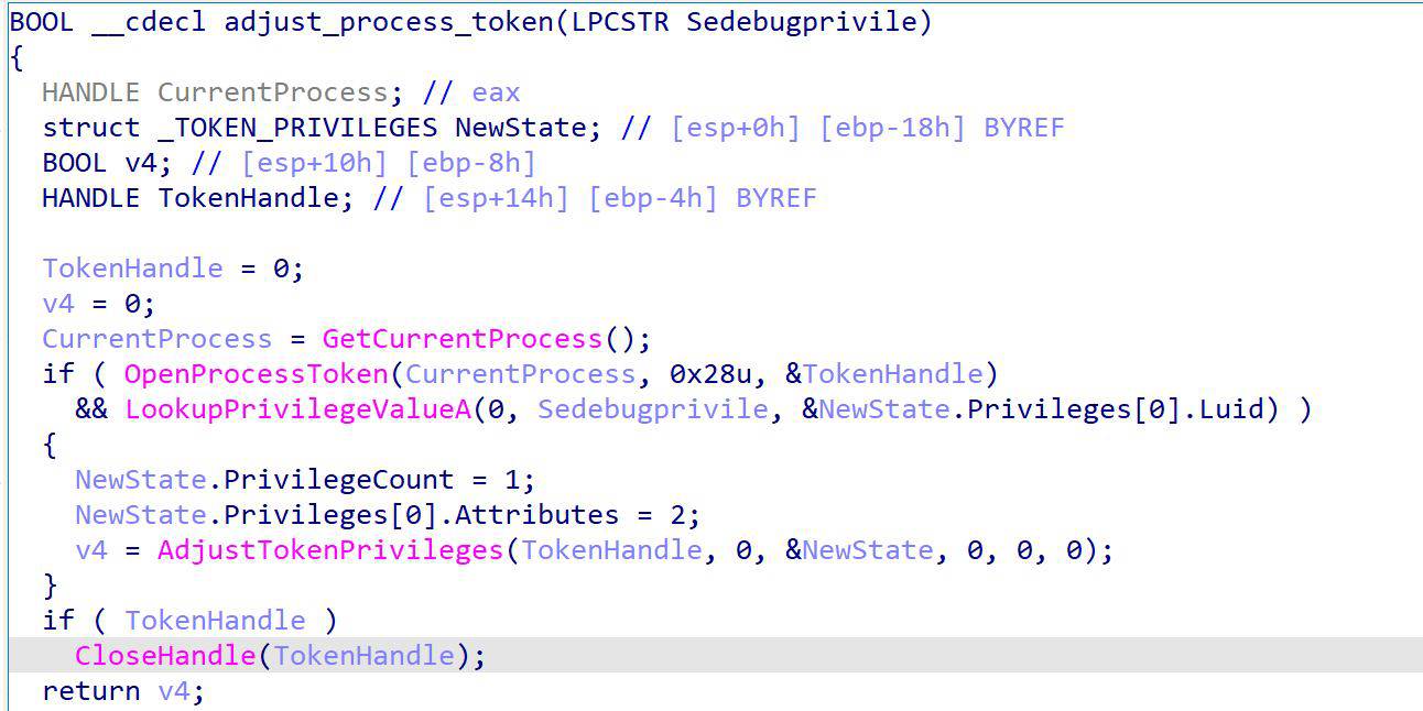 The implant starts by elevating permissions using the SeDebugPrivilege method, enabling the malware to access and read the memory of other processes. It leverages common Windows APIs to achieve this as shown in the pseudocode below: