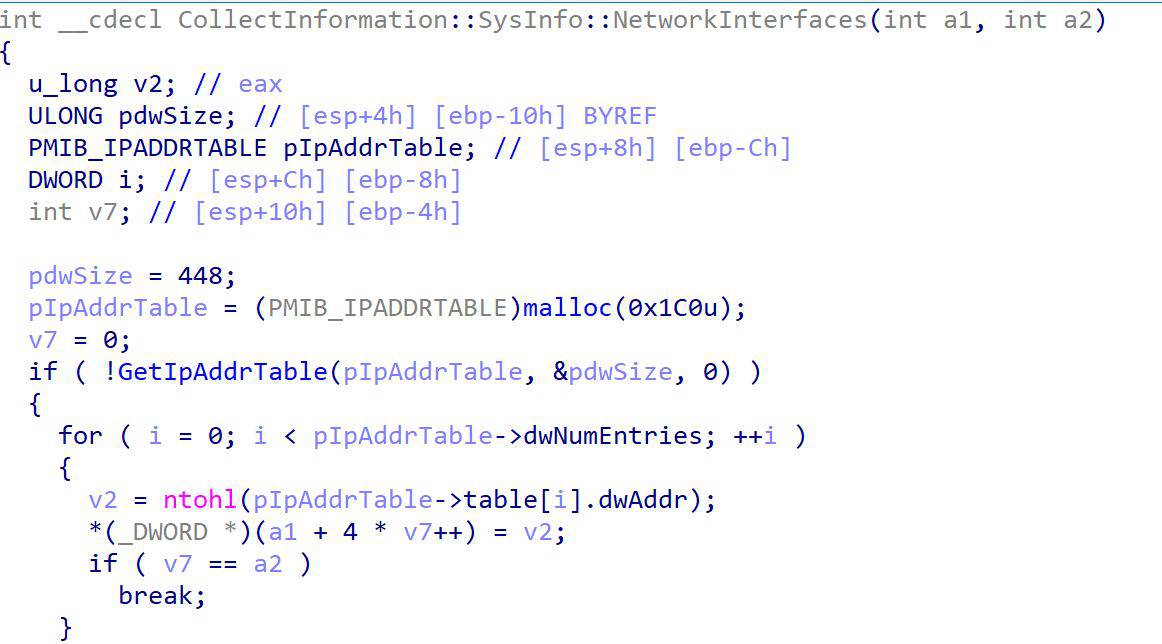 It collects the addresses of network interfaces connected to the infected machine by using the GetIpAddrTable Windows API.