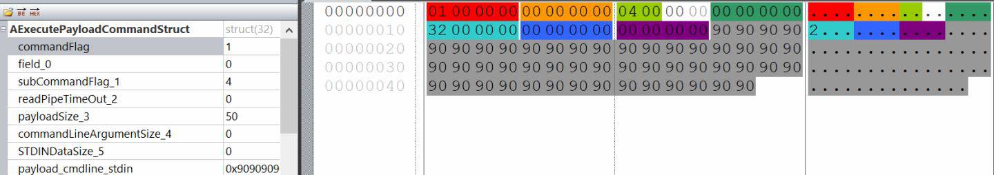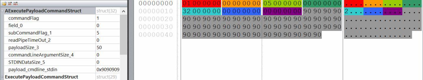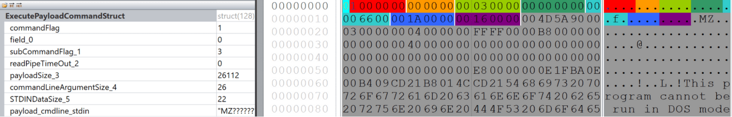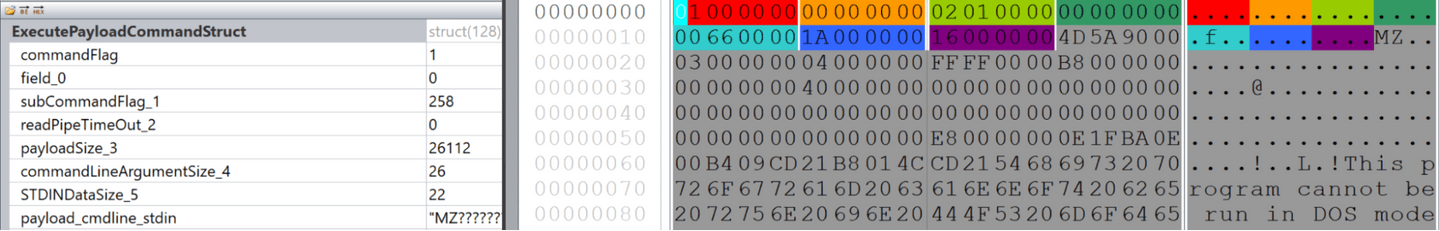 It will then 2-byte XOR encrypt the PE file and append it after the structure, the following is an overview of the written data to the allocated memory: