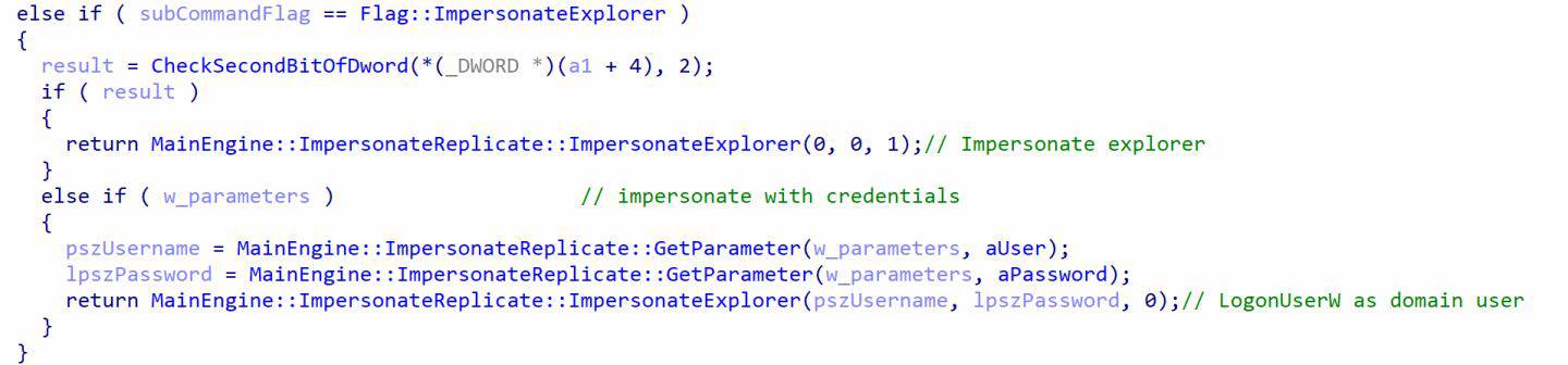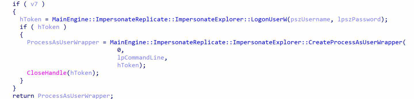 Then depending if the operator specified credentials or not, the malware will first call LogonUserW with the Domain\User and password to create a token then it will spawn another instance of the current process with this token.