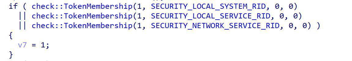 It will first check if the current process is a local system account or local service account or network service account by testing whether the given process token is a member of the group with the specified RID ( SECURITY_LOCAL_SYSTEM_RID , SECURITY_LOCAL_SERVICE_RID , SECURITY_NETWORK_SERVICE_RID ) respectively.