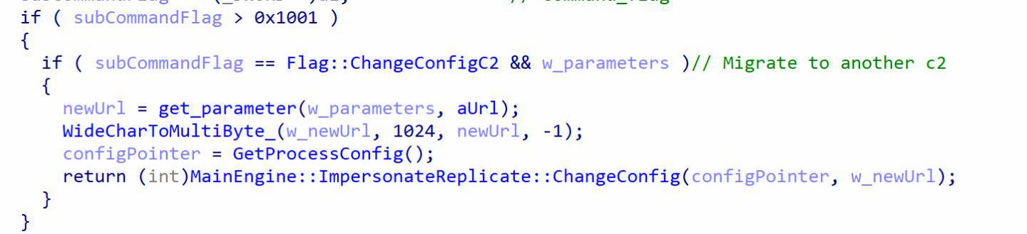 The operator can migrate the implant to another C2 server by specifying the subcommand 0x1001 with the IP address of the new C2.