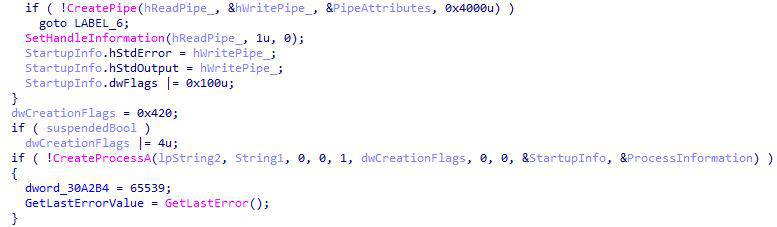 The malware then creates a suspended svchost.exe process with CreateProcessA API, writes the agent shellcode to the process, sets its instruction pointer to point to the injected shellcode with SetThreadContext , and finally it will resume the thread with ResumeThread to execute the injected payload.
