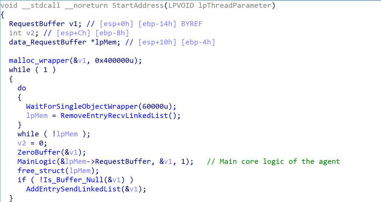 A working thread will first execute the RemoveEntryRecvLinkedList function that accesses and retrieves the data sent by the C2 server from the linked list.