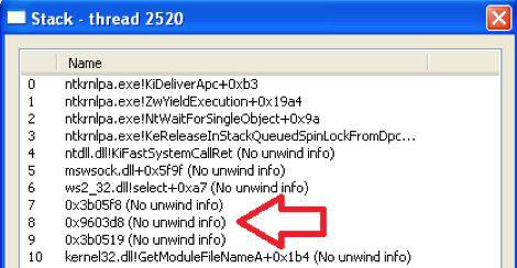 Typical code sections are of type ‘Image’ and map to a file on disk. However, these are type ‘Private’ and do not map to a file on disk. They are therefore referred to as unbacked executable sections or floating code. Threads starting from these types of memory regions are anomalous and a good indicator of malicious activity. ProcessHacker can also show you the call stack of the malware threads. There are multiple functions in the call stack which do not map to memory associated with loaded modules.