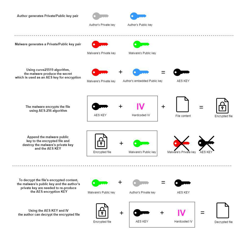 At this point, there are two sets of public/private keys: the authors and the malware’s.