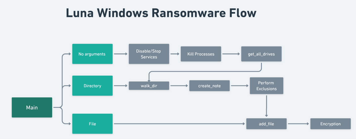 The Windows sample we found was a more full-featured product that included much of the functionality present in other mature ransomware families. It still includes the -dir and -file flags, but now if the malware is run without arguments, the Windows LUNA will perform some preliminary defense evasion, file protection preparation, and enumeration measures before entering the -dir execution loop. Additionally within the -dir execution flow Windows LUNA file and directory exclusions are functional and serve to protect critical system processes from being corrupted by encryption. This is different from what was observed with the Linux LUNA implementation which does not exclude sensitive OS directories or files that can impact system stability.
