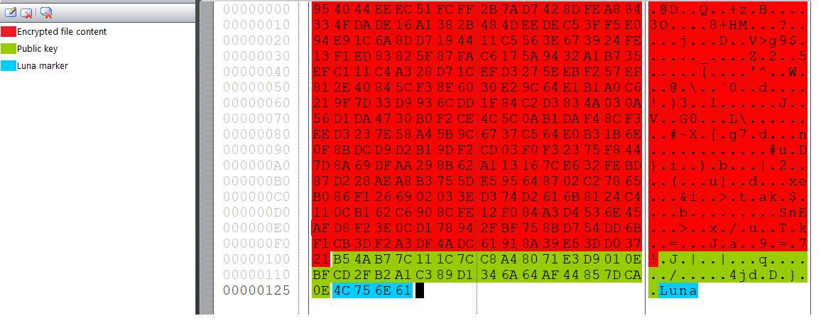 LUNA first overwrites the original file with the encrypted content, then appends the malware’s public key created for that file and the string “Luna” as a file marker. The extension .Luna is then added to the filename.