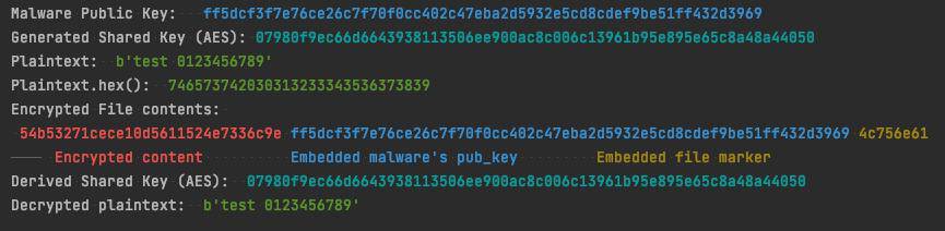 This Python script will display the malware public key, the shared AES key, the plain text as a string, the plain text as a hex value, the encrypted text, and finally decrypt the encrypted text back into the original plain text as a string.