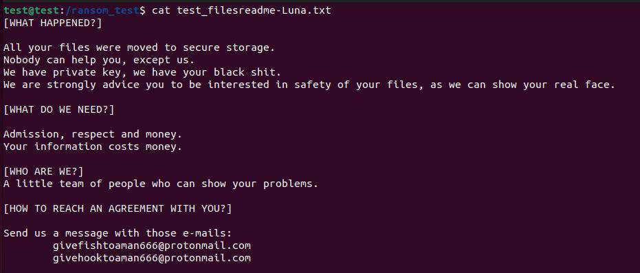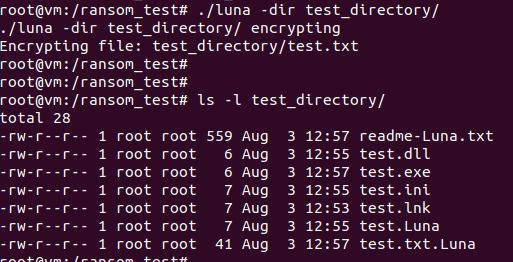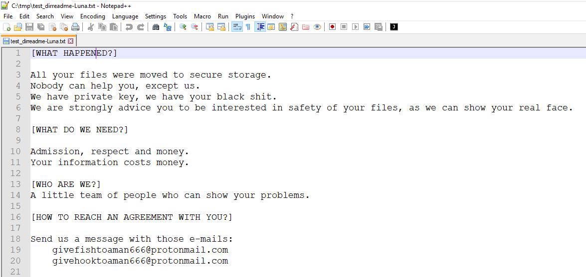All encrypted files are appended with a .Luna extension, i.e. /etc/passwd.Luna. If using the -dir flag, a r** eadme-Luna.txt ransom note will be created at the root of each encrypted directory as well as subdirectories such as /etc/readme-Luna.txt and /etc/ssl\readme-Luna.txt . While there are no ransomware notes dropped when encrypting an individual file using the -file flag, the encrypted file is still appended with the.Luna** extension.