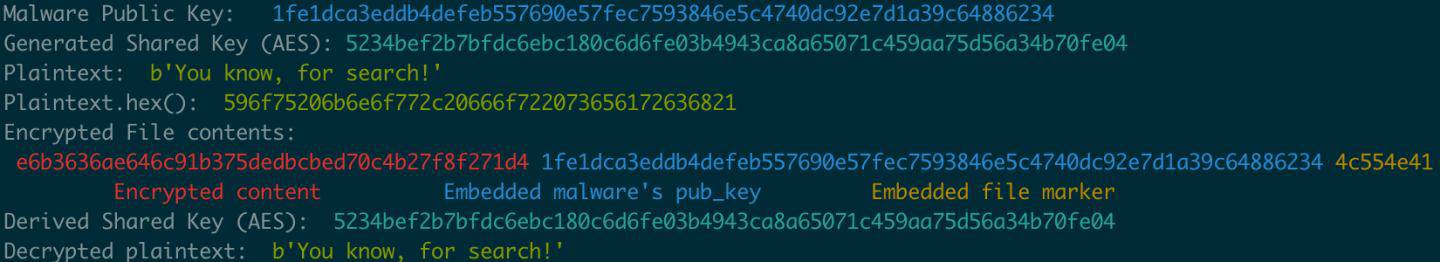 LUNA will then use the malware-generated private key and the author’s embedded public key to derive an AES key.