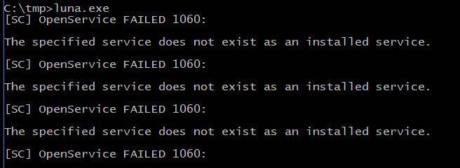 LUNA does not check that a service exists before issuing the service disable command. So it will commonly get 1060 errors to the console indicating that sc.exe attempted to modify a service that does not exist.