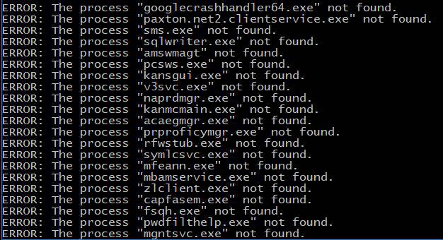 Once again, there are no checks that the process is actually running. TaskKill produces “process not found” errors printed to the console for attempts to kill non-existent processes.